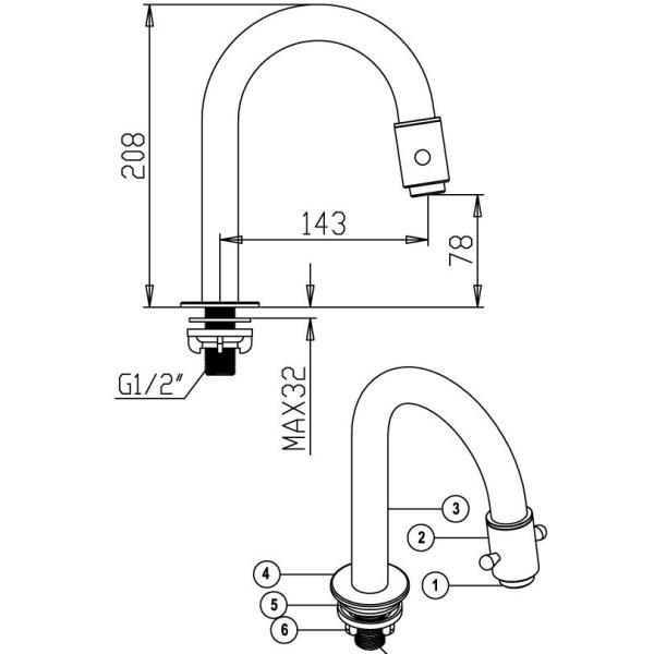 * Single hole installation, high arc shape,. Button rotating handle. cartridge cold only.